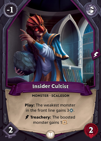 Play: The weakest monster in the front line gains 3 . Treachery: The boosted monster gains 1 [armor].